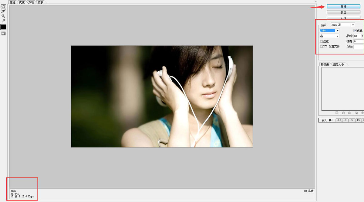 第三步:在彈出的界面中右側(cè),選擇圖片格式為jpg,質(zhì)量為高!這時候我們可以看到圖片大小只有38.84kb了,點擊存儲,保存到您電腦上,然后上傳就完全在網(wǎng)站上使用了!